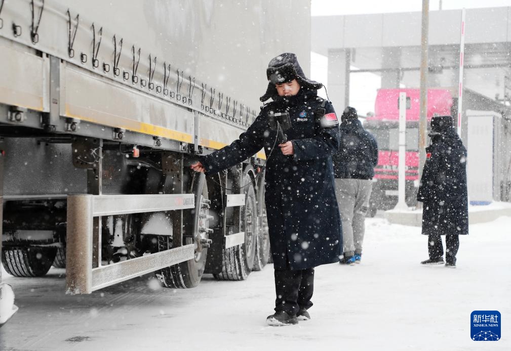 3月12日,在黑龙江省黑河公路口岸,黑河出入境边防检查站的民警在雪中查验入境车辆。