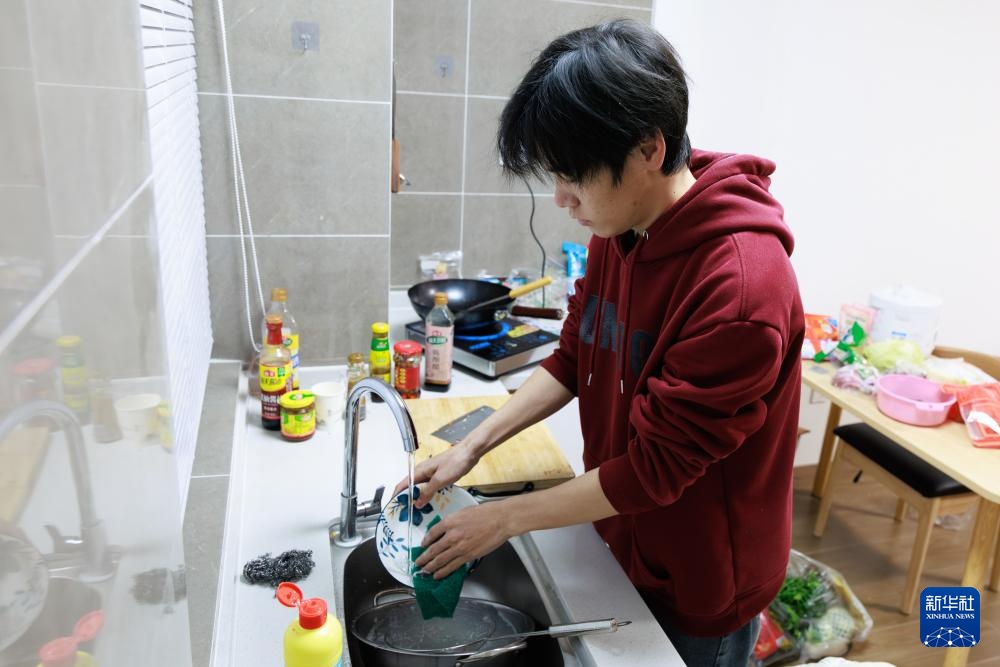 3月13日,一名求职青年在人才保障住房内洗碗。