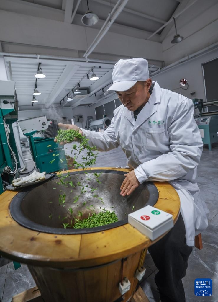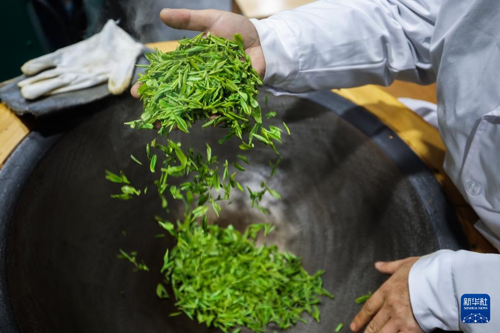 3月14日,在中泰街道枫岭村枫岭茶谷共富工坊里,茶厂工人为茶农手工炒制新茶,方便农户在自家茶家乐售卖。