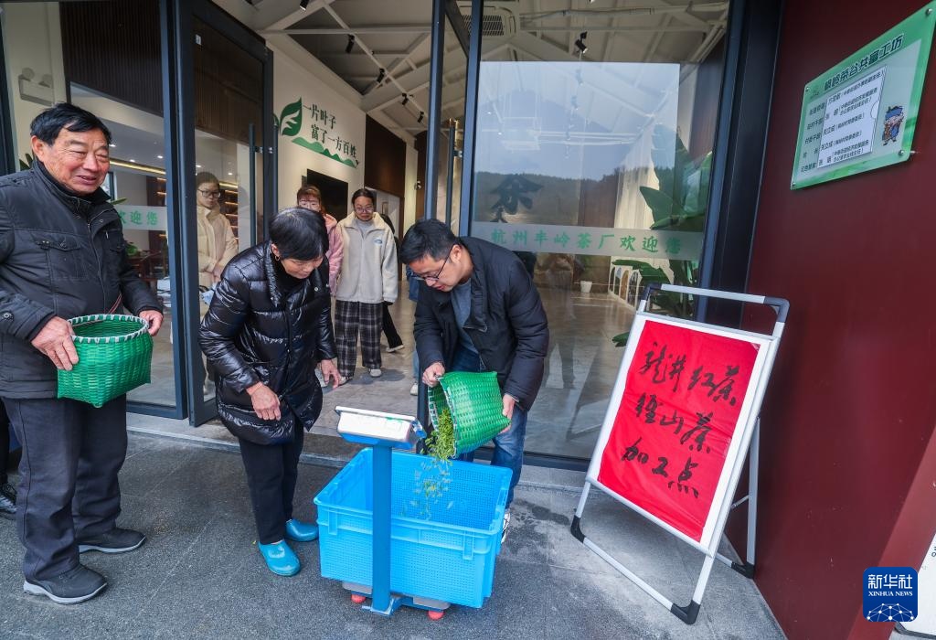 3月14日,在中泰街道枫岭村的枫岭茶谷共富工坊里,村里的茶农把自家采摘的鲜叶交给茶厂代加工,方便在自家茶家乐售卖。