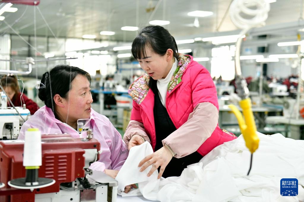 3月12日,在菏泽爱依德服饰有限公司,一位工作人员在指导新员工加工衣服。