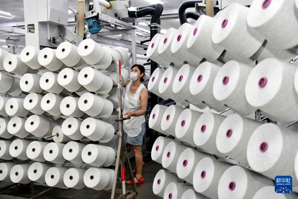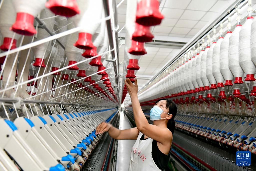 3月12日,在郓城县蓝翔纺织有限公司,工作人员在摆放纱锭。