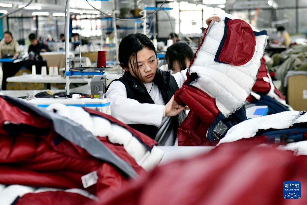 3月12日,在菏泽爱依德服饰有限公司,工作人员在整理成衣。