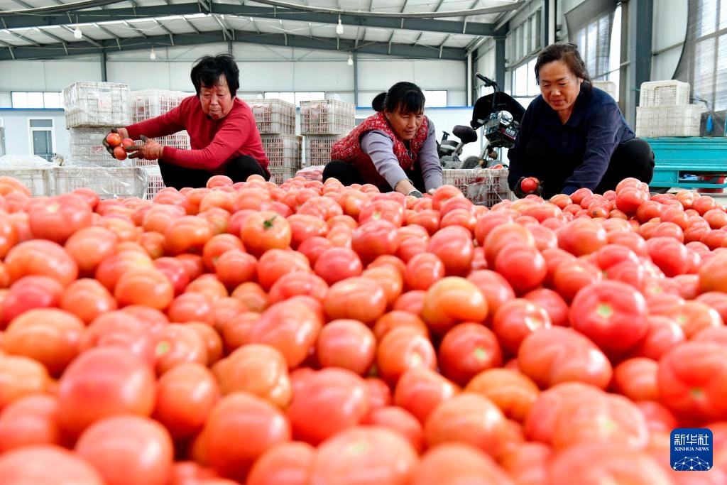 3月13日,在郓城恒天然农业发展科技有限公司,菜农将西红柿装筐。