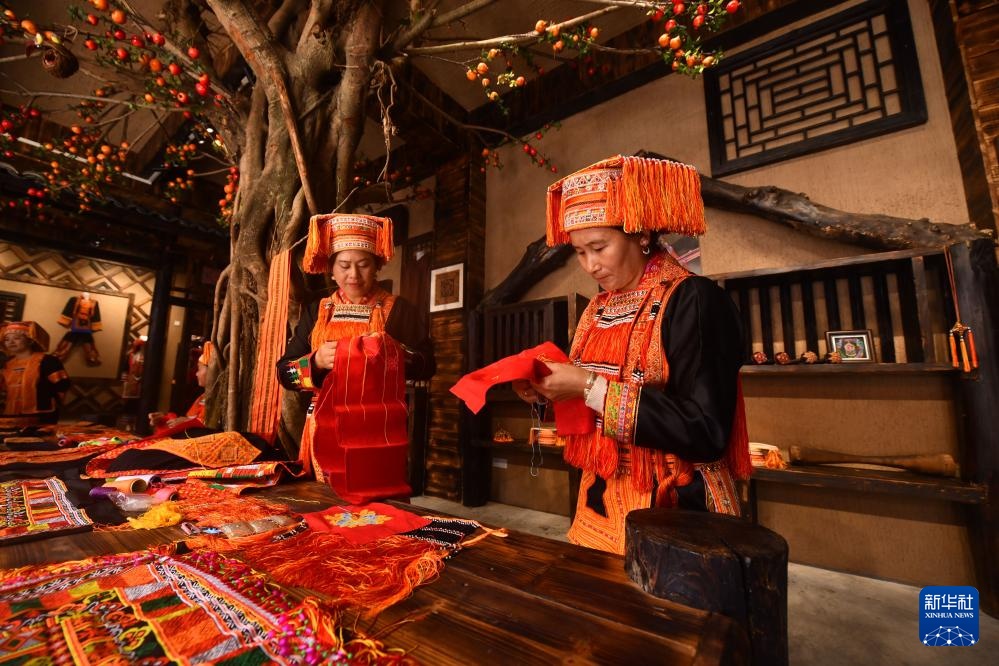 在广西蒙山县长坪瑶族乡长坪村一家民俗商店,瑶族村民在刺绣(2024年10月23日摄)。