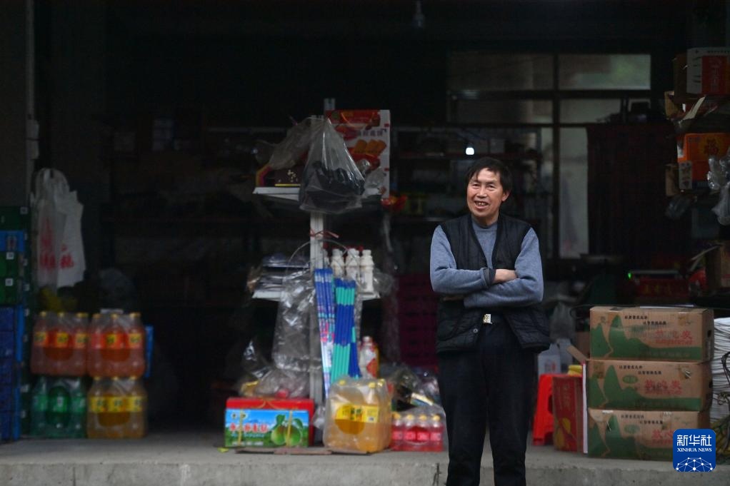 在广西融水苗族自治县杆洞乡党鸠村,商店店主吴成新站在店门口(2025年3月12日摄)。