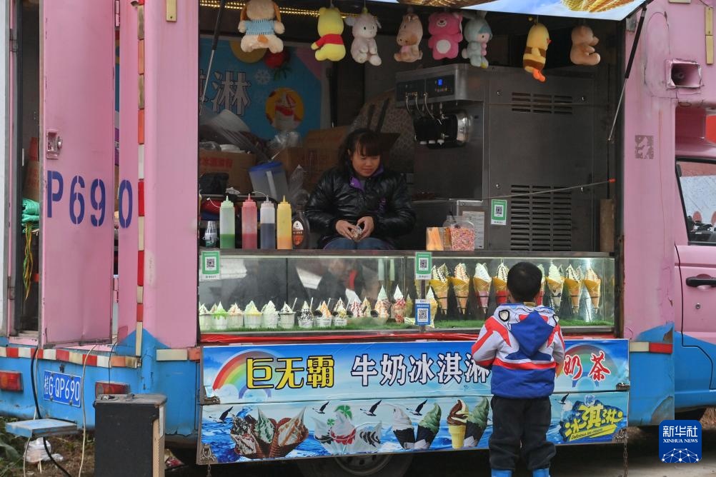 在广西融水苗族自治县安陲乡江门村,一名小朋友在“流动冰淇淋店”购买冰淇淋(2025年2月14日摄)。