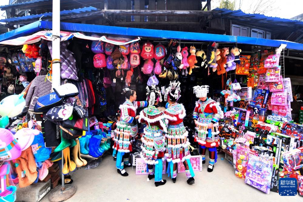 在广西融水苗族自治县杆洞乡杆洞村,人们在一家箱包鞋店选购商品(2025年2月5日摄)。