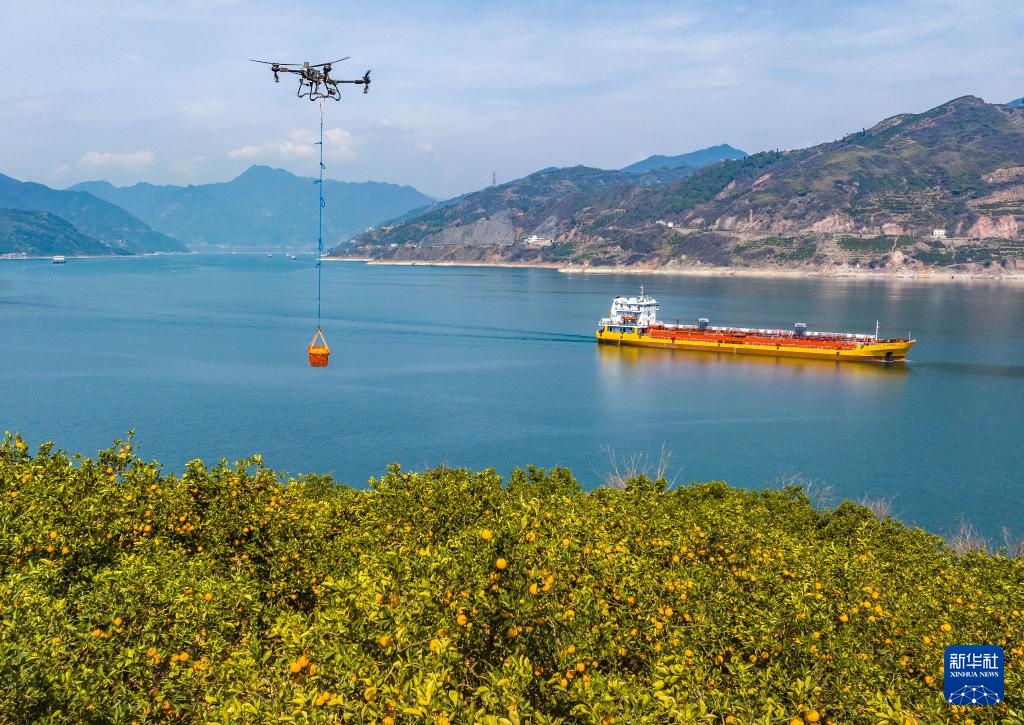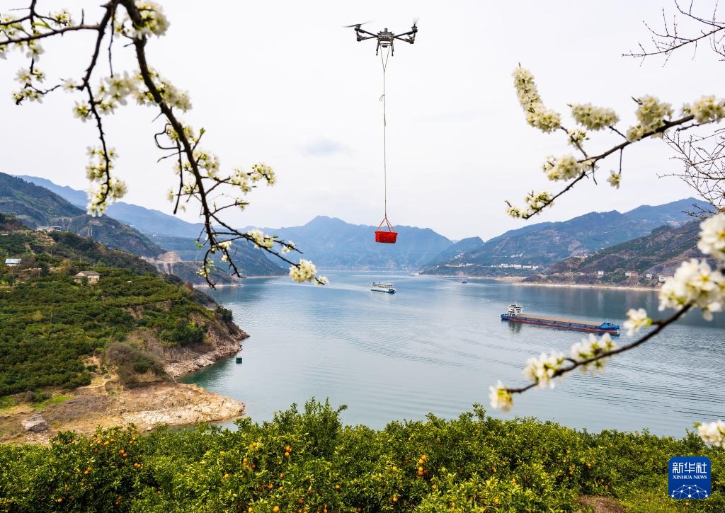 3月17日,湖北省秭归县郭家坝镇邓家坡村村民用无人机转运脐橙。