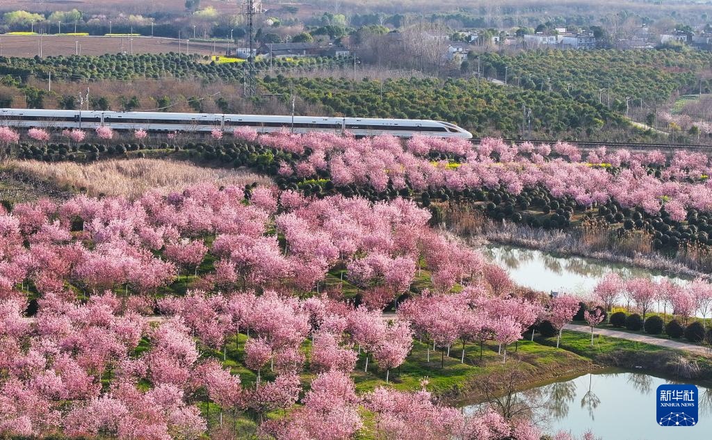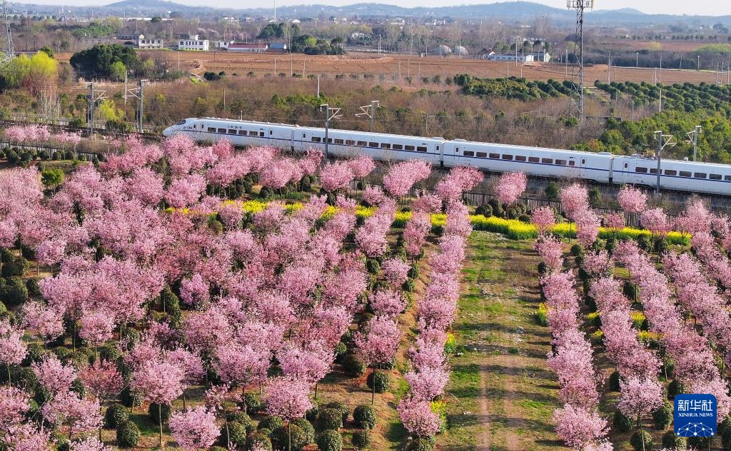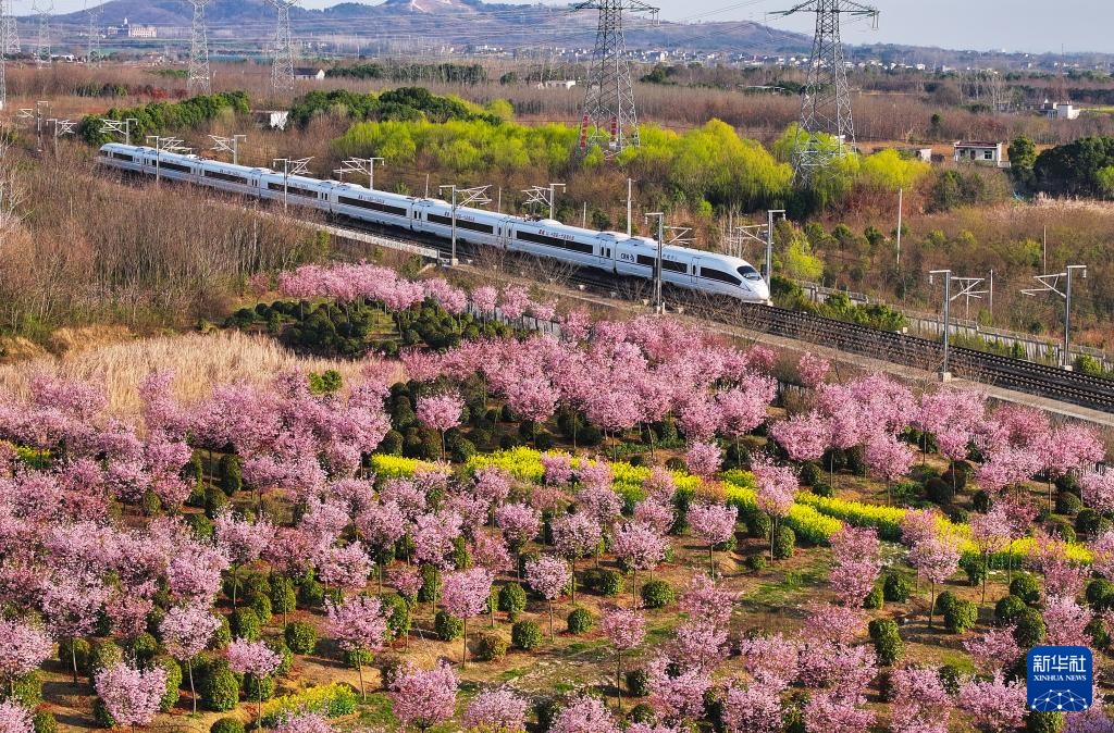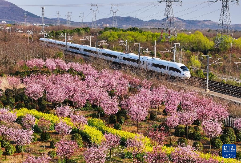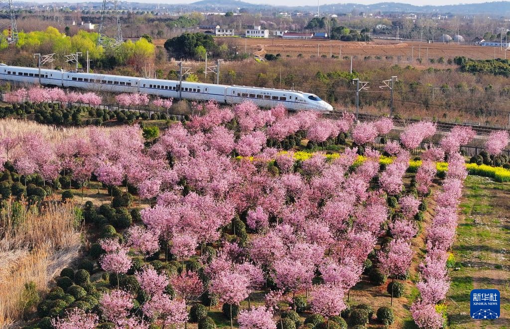 仲春时节,安徽省合肥市肥东县长临河镇合福高铁沿线樱花盛放,疾驰的列车与粉白相间的“樱花海洋”相映成趣,绘就生机勃勃的春日图景。