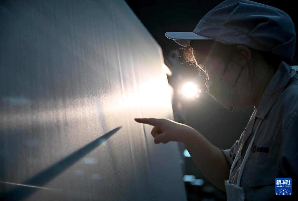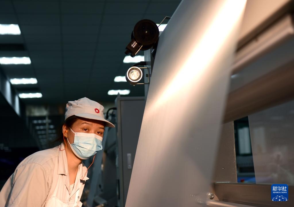 3月19日,工人在河南光远新材料股份有限公司电子布生产车间进行巡台检验。