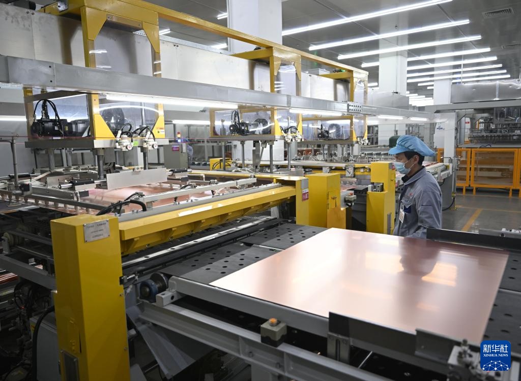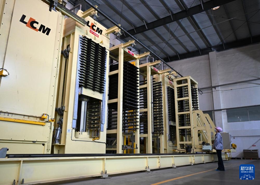 3月19日,工人在林州致远电子科技有限公司覆铜板生产车间查看冷热一体压机运行状态。