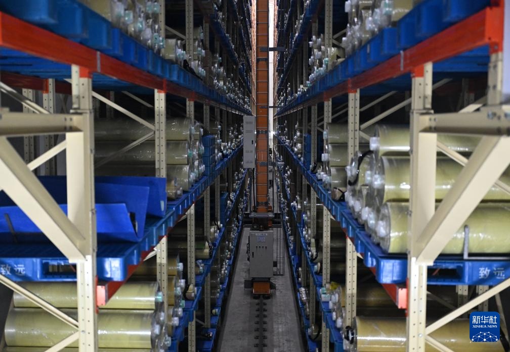 3月19日,林州致远电子科技有限公司覆铜板生产车间内的自动化仓储系统正在运行。