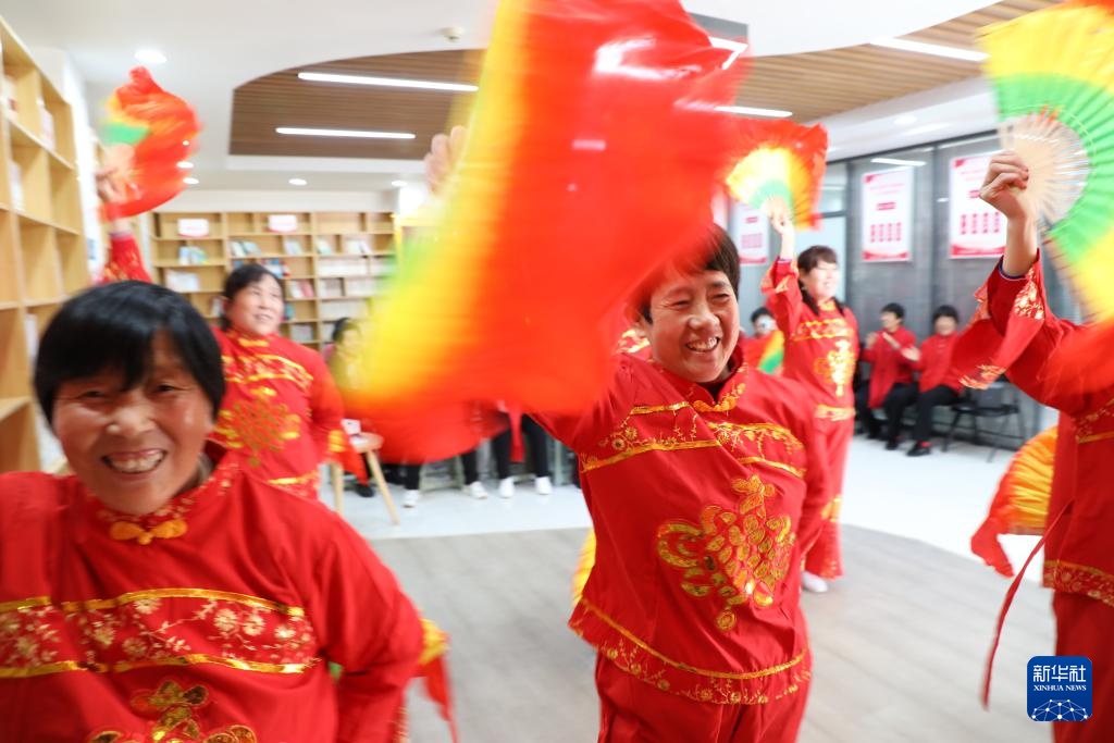 3月18日,在山东省滨州市博兴县博昌街道锦绣社区,锦绣社区老年大学的学员为社区居民表演舞蹈。