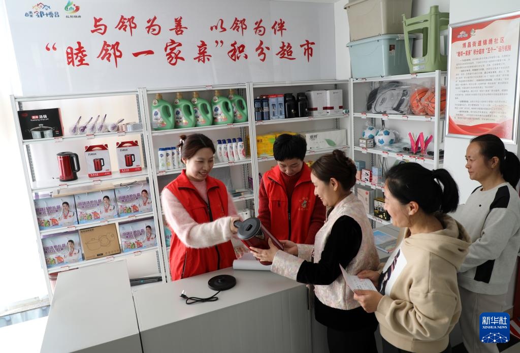 3月18日,在山东省滨州市博兴县博昌街道锦绣社区“睦邻一家亲”积分超市,社区居民使用参加志愿服务累积的积分兑换奖品。
