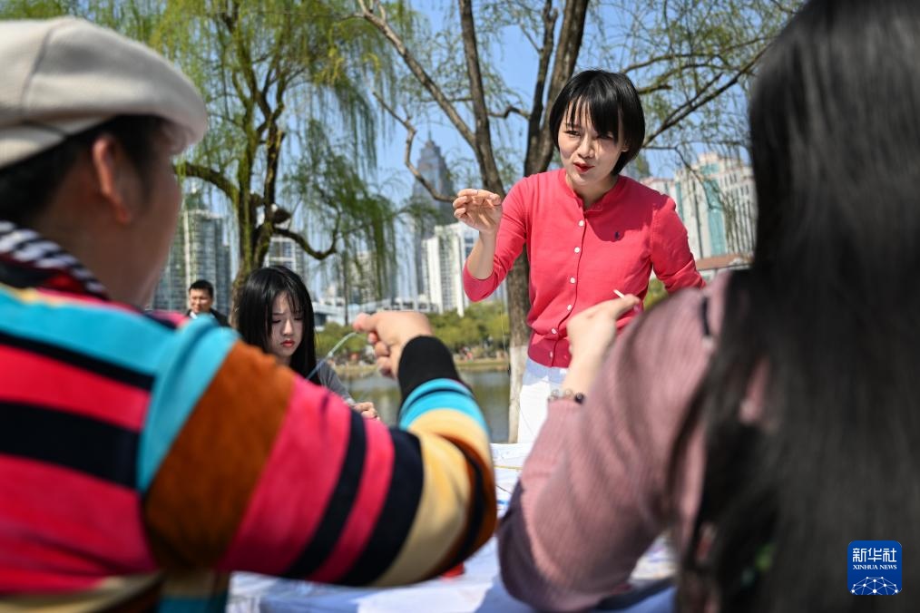 3月19日,在任炜汉绣工作室附近的公园里,任炜的女儿王炜佳在与汉绣爱好者交流汉绣技法。