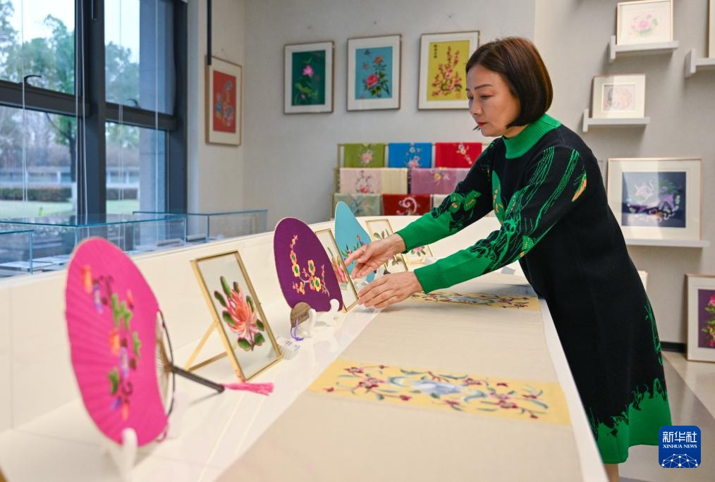 3月14日,在武汉市任炜汉绣工作室,任炜在观看展出的刺绣作品。