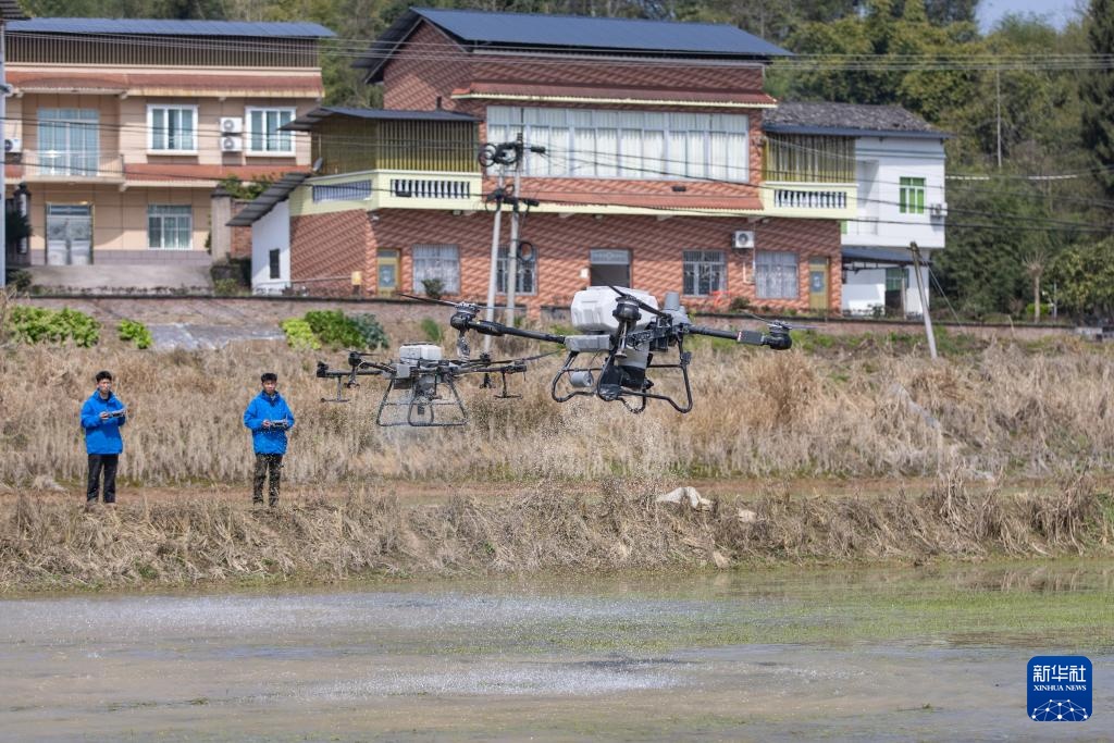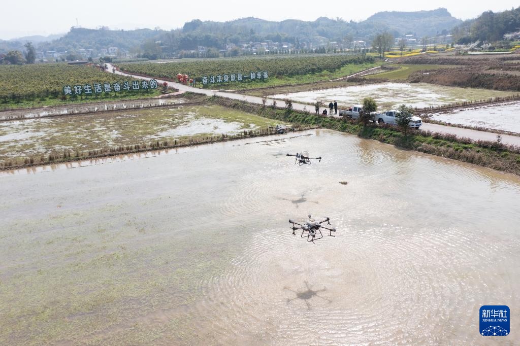 3月20日,在重庆市梁平区仁贤街道五一社区,重庆田中秧农业科技股份合作社的技术人员操作植保无人机在农田实施施肥作业。