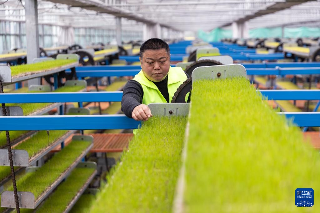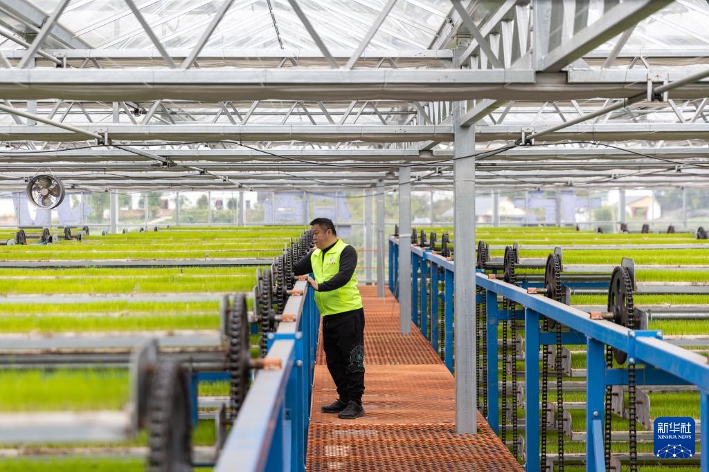 3月19日,在重庆市永川区仙龙镇双星村智能育秧基地,技术人员在育秧育苗区查看秧苗的生长情况。
