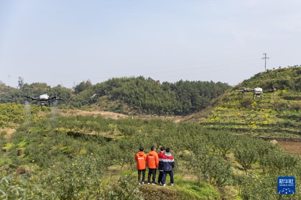 3月20日,在重庆市梁平区屏锦镇万年社区,重庆市味源现代农业专业合作社的技术人员操作植保无人机喷洒营养液。