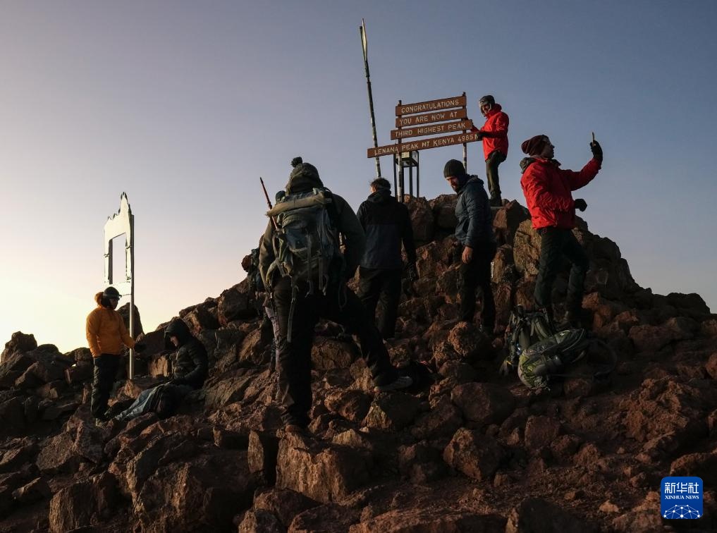 3月15日,在肯尼亚山国家公园,登山者在肯尼亚山第三高峰莱纳纳峰顶拍照留念。