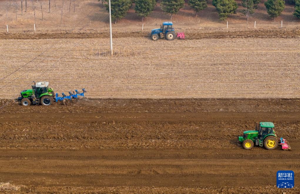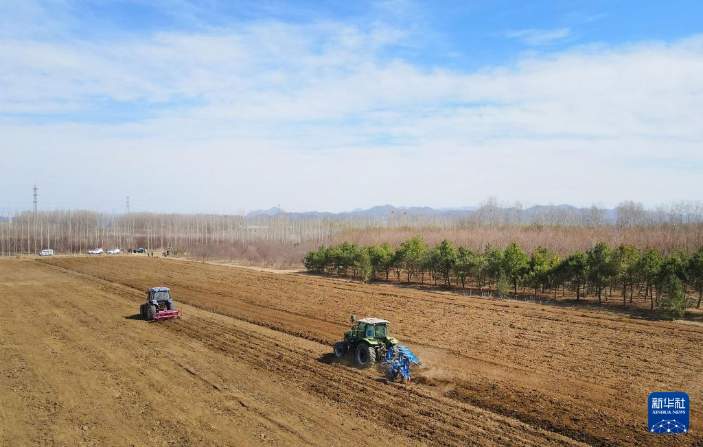 3月21日,在北京市平谷区峪口镇的一处农田,工作人员驾驶农机翻耕土地(无人机照片)。
