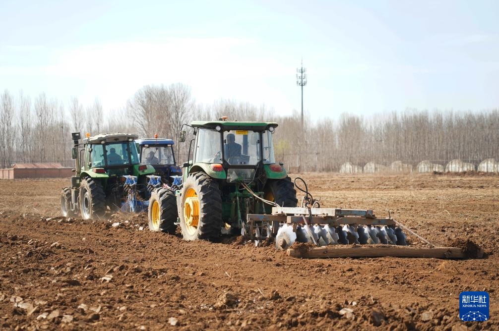 3月21日,在北京市平谷区峪口镇的一处农田,工作人员驾驶农机翻耕土地。