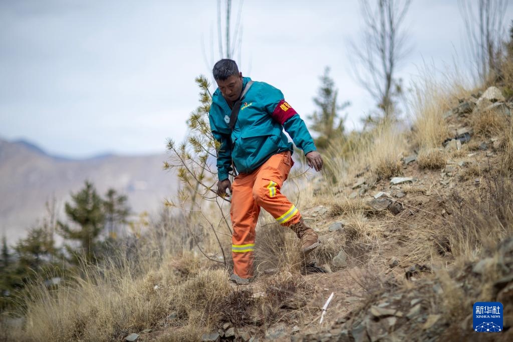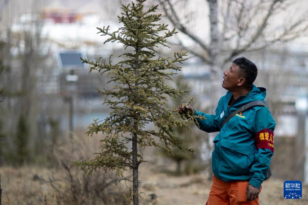 扎西曲培在南山公园查看树木长势(2025年3月20日摄)。