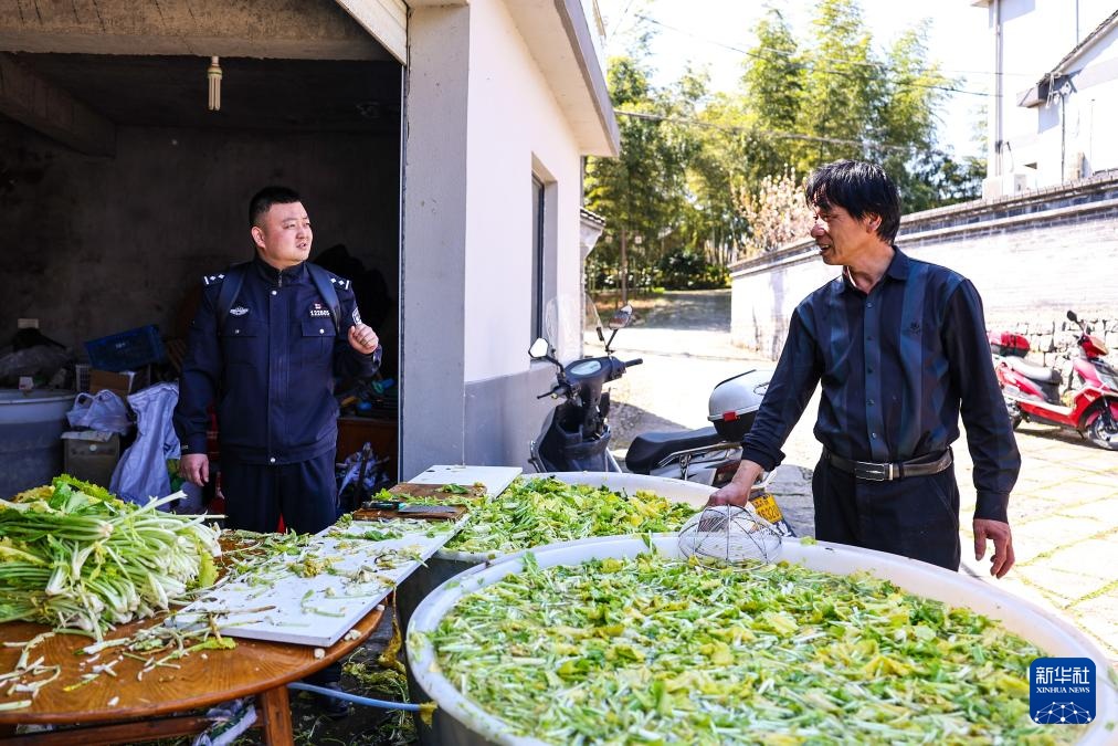 3月21日,梁弄派出所民警葛锡淡(左)在余姚市梁弄镇汪巷村走访农家乐经营者。