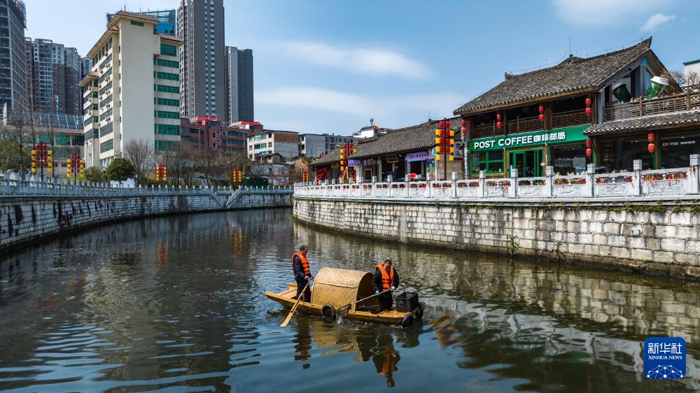 3月21日,志愿者在贵州省安顺市西秀区安顺古城历史文化街区贯城河河道打捞漂浮物(无人机照片)。