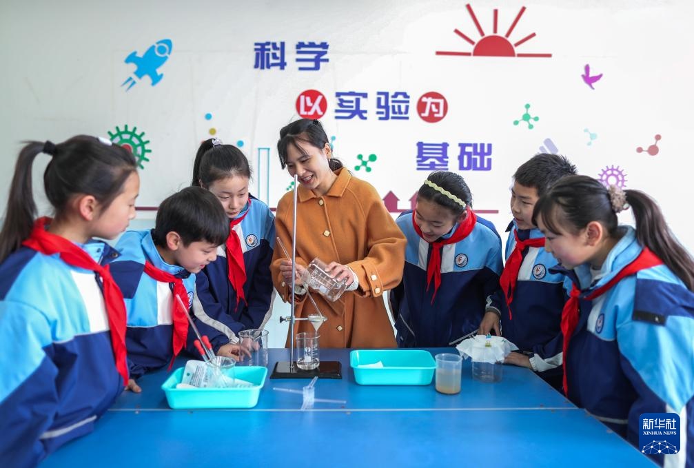 3月21日,在江苏省泰州市姜堰区淮海小学,老师指导学生进行滤水实验。