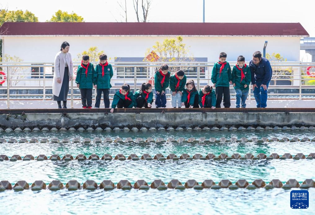 3月21日,江苏省泰州市姜堰区一家自来水厂的工作人员给姜堰区康华小学的学生讲解水质处理流程。