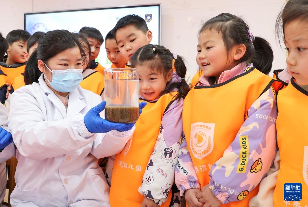 3月21日,在江苏省连云港经济技术开发区港逸幼儿园,水务工作人员为幼儿园小朋友做污水净化小实验。