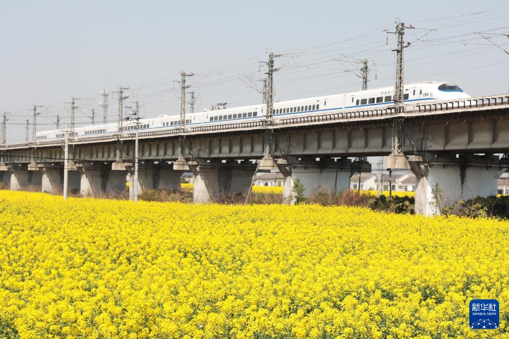 3月21日,一列动车组列车从湖北省枝江市十里店村油菜花海通过。