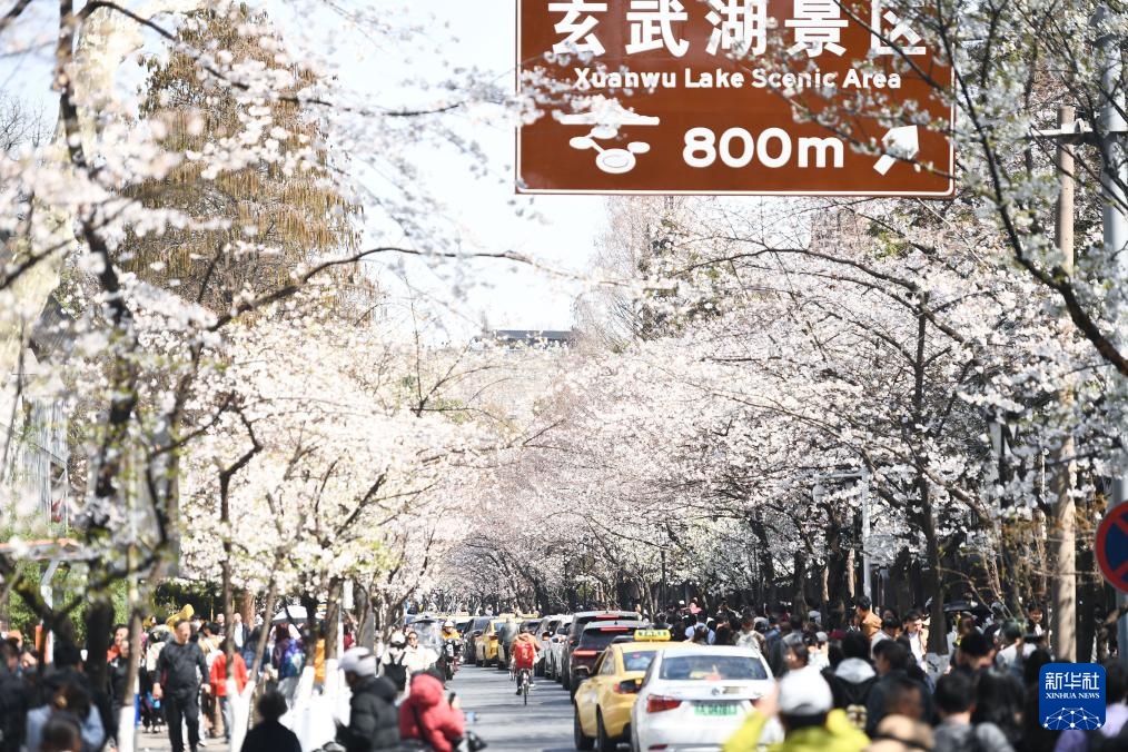 3月21日,游客在江苏南京鸡鸣寺樱花大道观赏樱花。