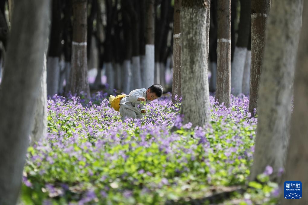 3月21日,小朋友在浙江省嘉兴市穆湖森林公园观赏二月兰。