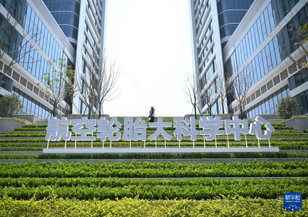 3月21日,工作人员从航空轮胎大科学中心标牌旁走过。