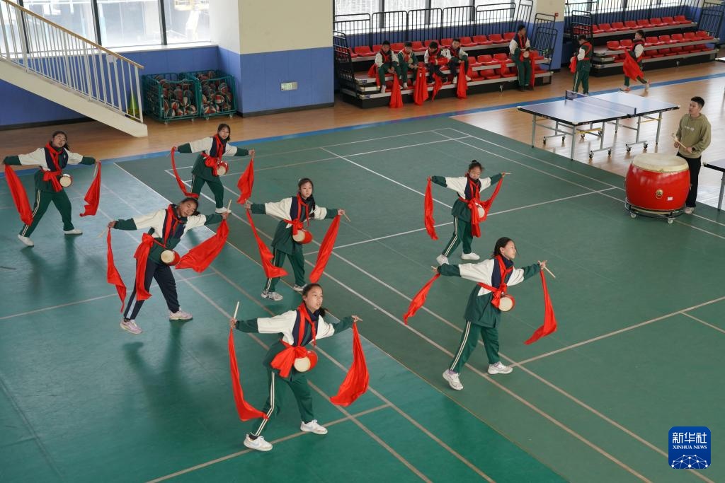 3月21日,在西安市曲江第六小学,学生在特色体育课上练习腰鼓。