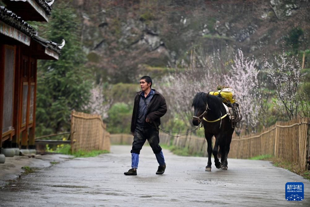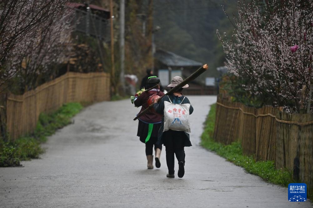 在广西融水苗族自治县杆洞乡党鸠村,村民劳作归来(3月12日摄)。