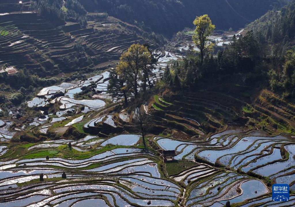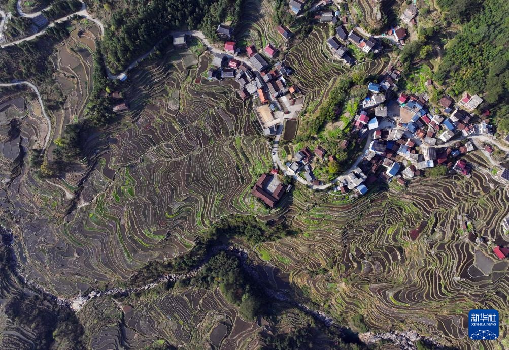 这是广西融水苗族自治县安太乡小桑村的田园春景(3月21日摄,无人机照片)。