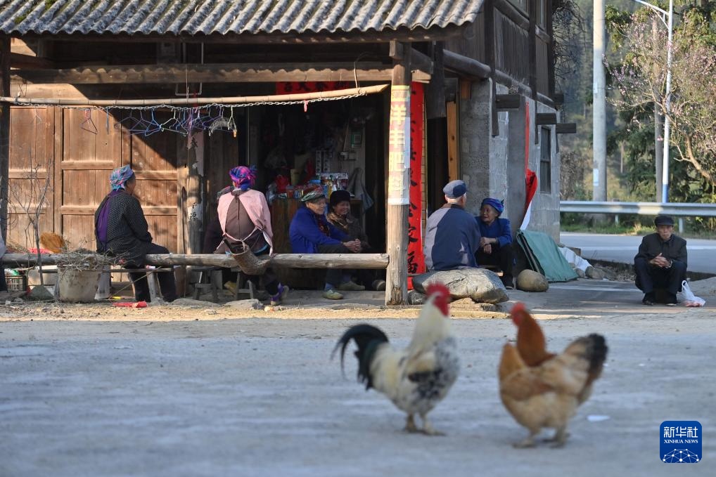 在广西融水苗族自治县安太乡江竹村,劳作归来的村民们在村口聊天(3月20日摄)。