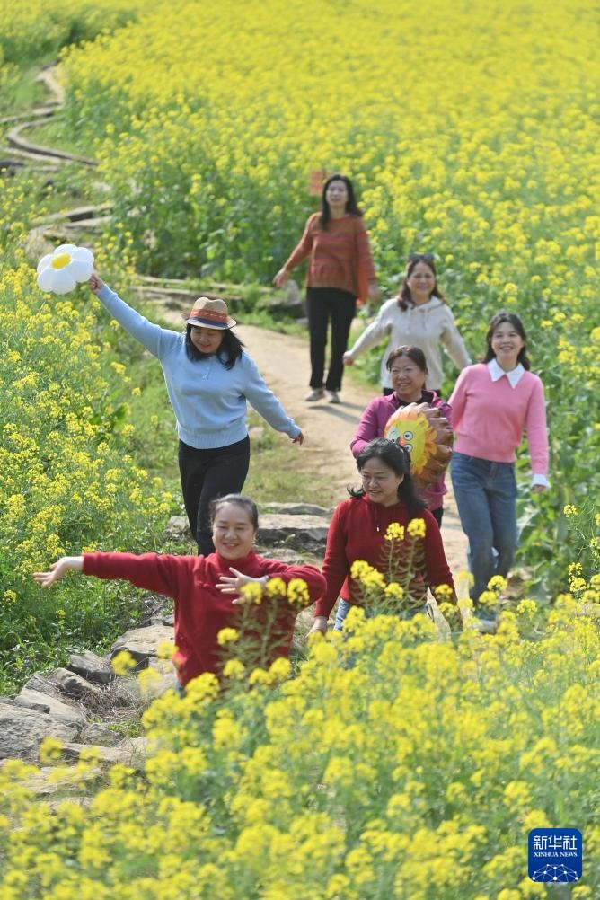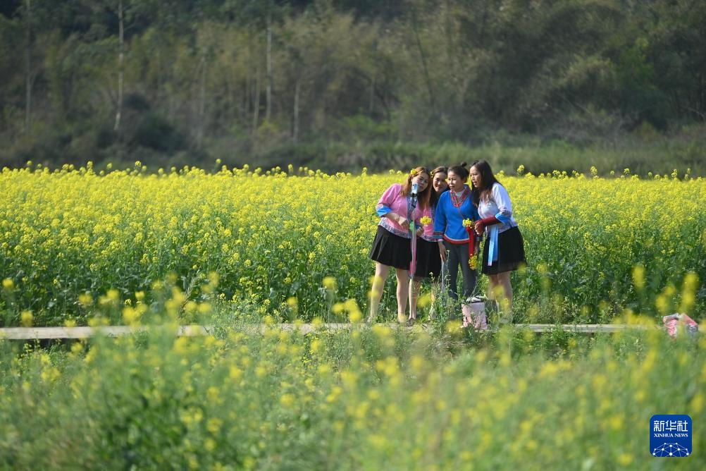 游客在广西融水苗族自治县融水镇新国村的油菜花地踏青游玩(3月21日摄)。