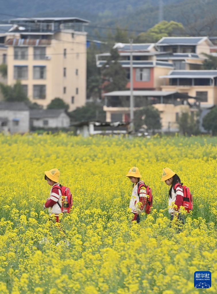 在广西融水苗族自治县融水镇新国村,小朋友在油菜花地踏青游玩(3月21日摄)。