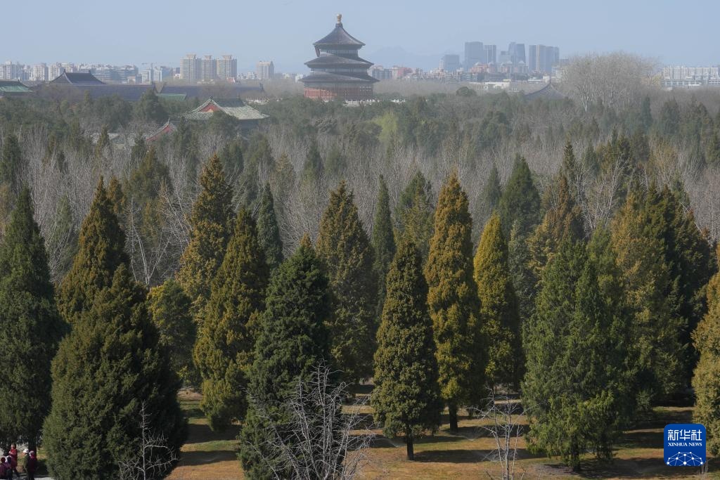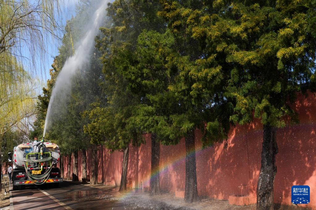 在北京天坛公园内,工作人员对柏树进行喷淋(3月21日摄)。
