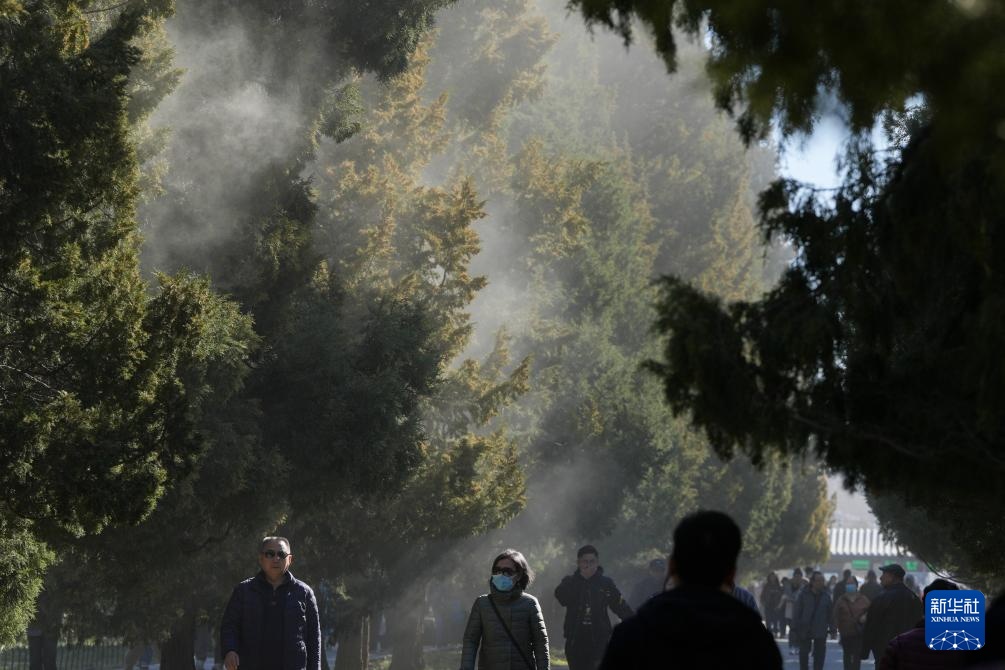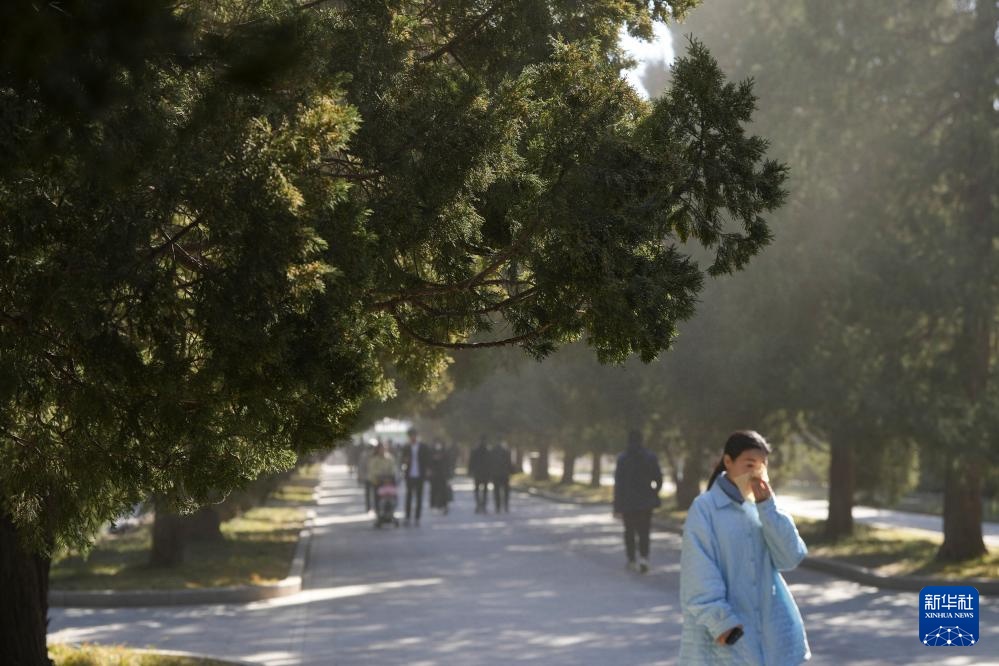 大风吹拂下,北京天坛公园上空弥漫着花粉雾,公园开启草地喷灌设施应对(3月21日摄)。