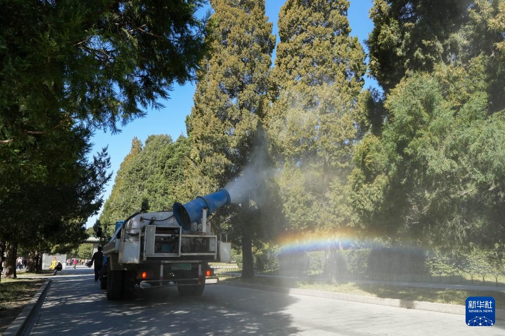 在北京天坛公园,工作人员驾驶雾炮车对飘散花粉的柏树进行喷淋(3月20日摄)。