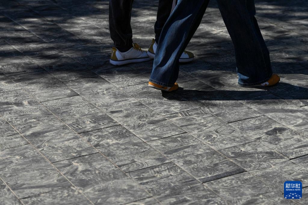 在北京天坛公园,游人走过一处覆盖着柏树花粉的地面(3月20日摄)。