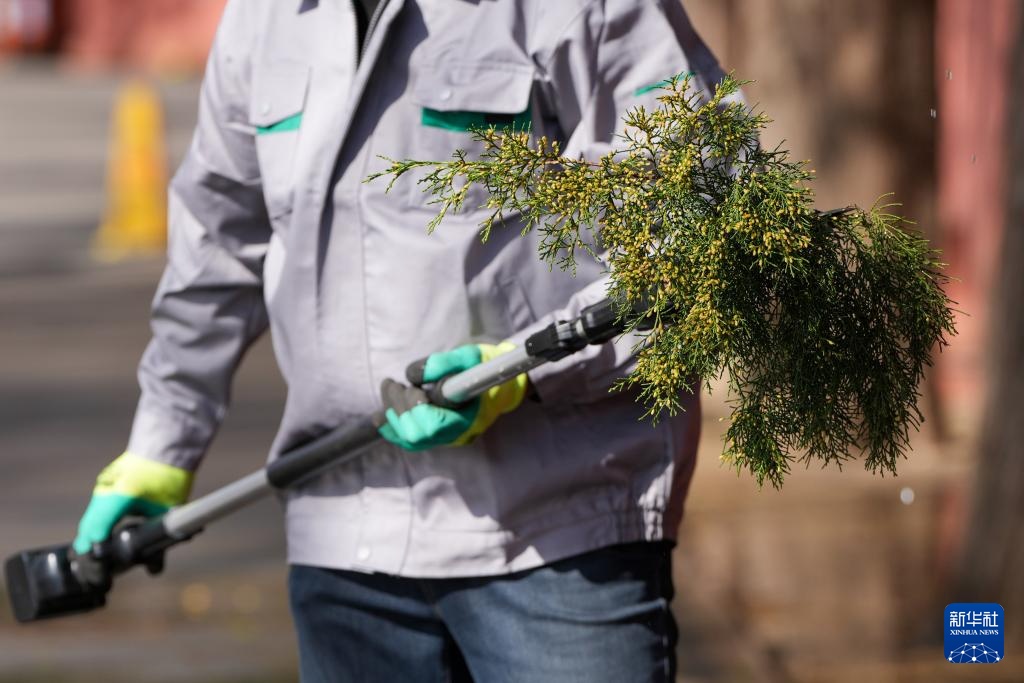 在北京红领巾公园内,工作人员修剪开花的柏树(3月19日摄)。