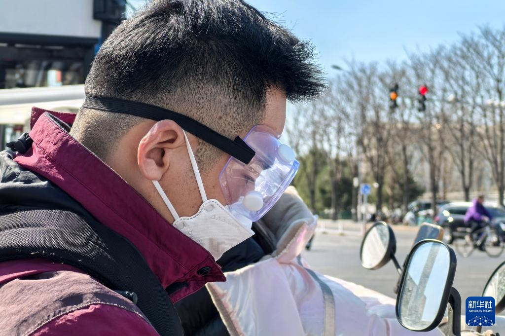 在北京街头,一名游客戴着护目镜和口罩防范花粉(3月21日摄)。