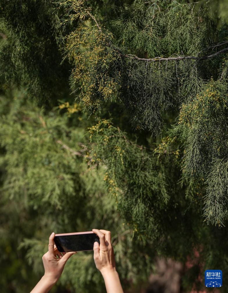 在北京红领巾公园内,一位游客拍摄开花的柏树(3月19日摄)。
